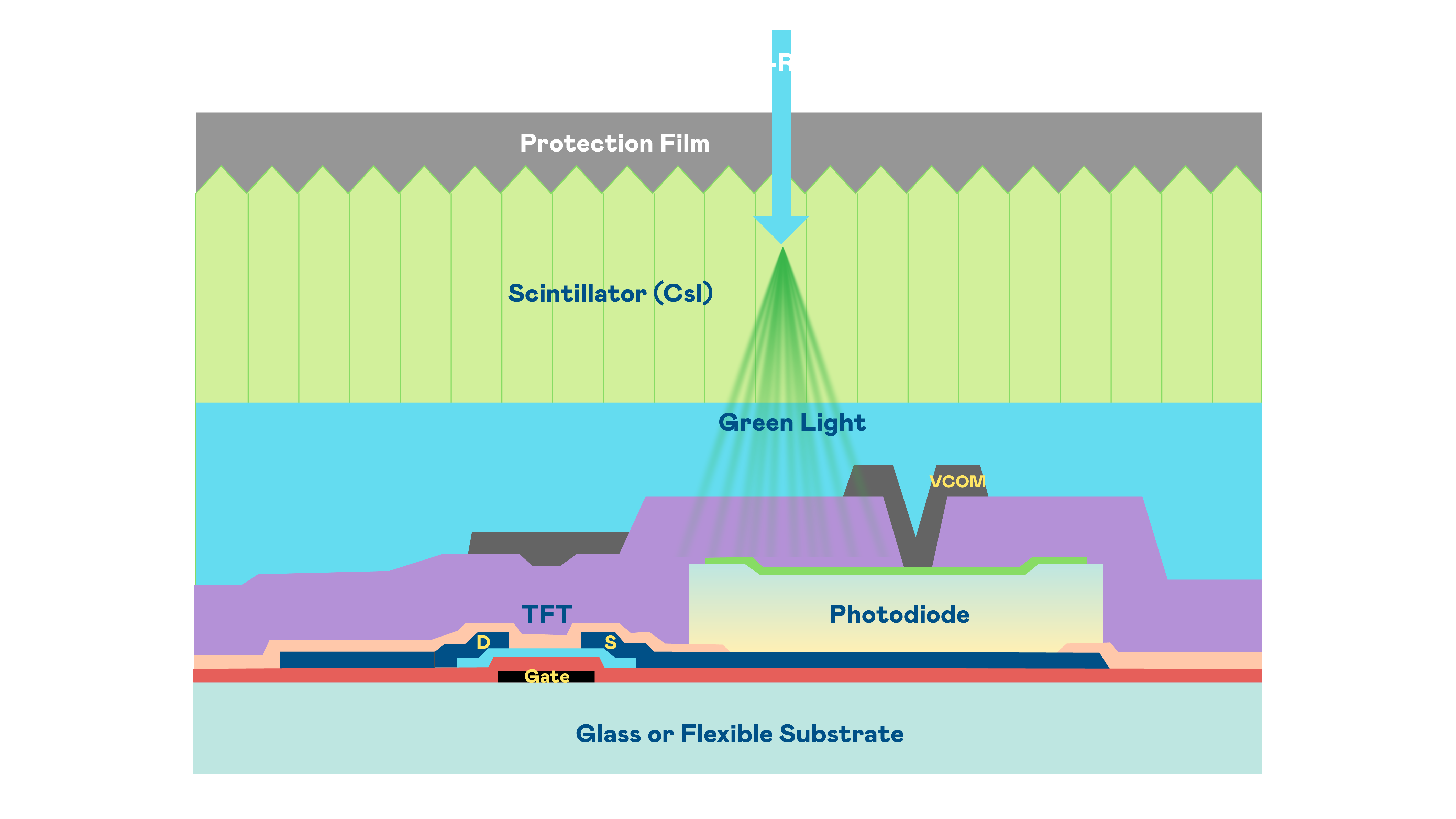 AG真人平台的X光影像感测阵列使用薄膜电晶体 (TFT) 作为每个像素的读取开关,搭配光电二极体(Photodiode)的光电转换元件,用以感测X光影像讯号。